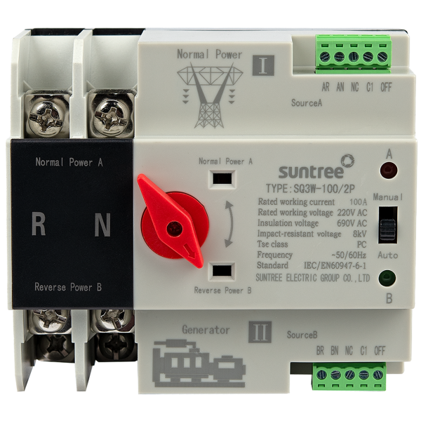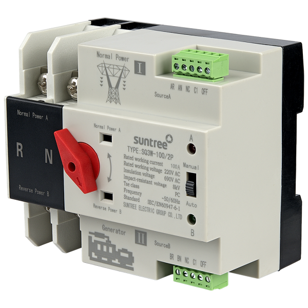 Устройство автоматического ввода резерва переменного тока, 1 фаза, 230В, 100А, 2 полюса. Применяется для непрерывной подачи питания потребителю, автоматически переключая питающие линии при пропадании фазы на одной из них.
