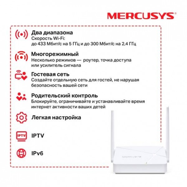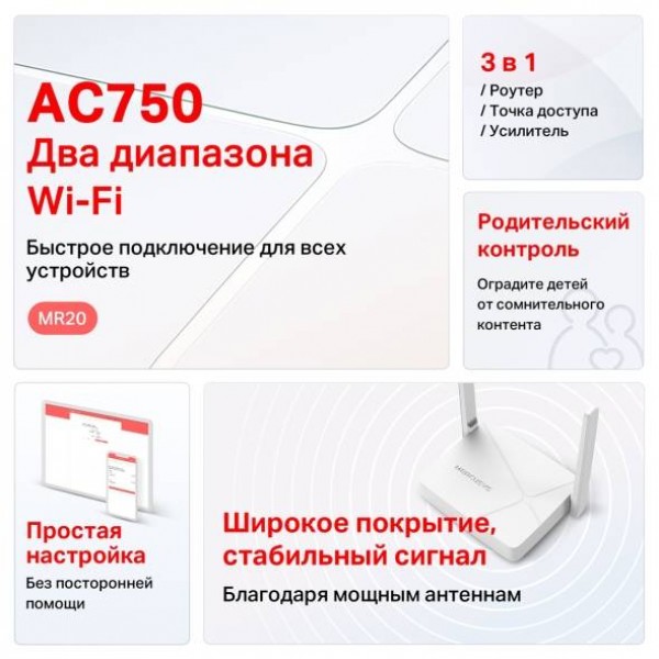 Mercusys MR20 Двухдиапазонный Wi-Fi роутер AC750, до 300 Мбит/с на 2,4 ГГц + до 433 Мбит/с на 5 ГГц